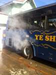 Bereits um 5 Uhr ist Tagwache und unser Bus fährt um 5.30 Uhr ab Richtung Mandalay. Er ist gut gefüllt mit Locals. Für 4.5$ fahren wir 5 Stunden Bus. Schon kurz nach der Abfahrt beginnt die junge Mutter mit Baby vor uns zu kotzen. Auf der ganzen Fahrt füllen alle Passagiere rund um uns ihre Kotztüten in regelmässigen Abständen. Uns geht’s gut und wir essen sogar das Ei, welches uns im Lunchsäckli vom Guesthouse mitgegeben wurde. In Pyin U Lwin gibt es einen Boxenstopp und der Car wird mit Wasser gekühlt… die Bremsen sind auch dringend notwendig – nur knapp entgehen wir auf der Fahrt einem frontalen Crash. Um halb 11 erreichen wir schon Mandalay. Wir marschieren an die nächste Strasse, da die Taxichauffeure uns abzocken wollen. Per Motorbike-Taxi fahren wir dann doch noch zurück ins Treasure wo wir auch gleich unser Zimmer beziehen können. Fast wie nach Hause kommen…