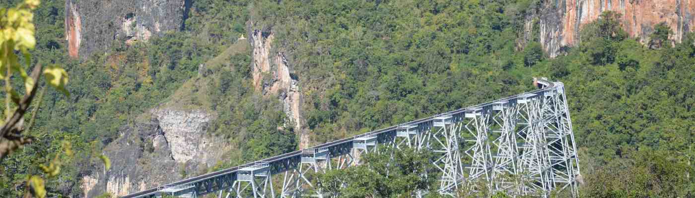 Auf der Dachterrasse gibt es Frühstück und per Motorbike fahren wir zum Bahnhof. Bis ein Klingeln den nächsten Zug ankündigt, passiert am Ticketschalter erst mal gar nix. Danach brauchts den Pass um ein Ticket zu lösen und mit viel Schreibkram erhalten wir für 6 $ das Zug-Ticket für Uper Class nach Hsipaw. Die Zugfahrt führt uns weiter Richtung Nord-Ost. Die Landschaft ist gewaltig. Blumenfelder und Getreidefelder so weit das Auge reicht. Bauern die auf den Feldern arbeiten und das Korn zu Hütten aufbauen. Immer mal wieder einen Bahnhof „out of the kraut…“ . Das Highlight ist natürlich das Gokteik-Viadukt welches über eine vielleicht 150 Meter hohe Schlucht führt. Das alte Bahngleis in der Schlucht ist noch ersichtlich. Ganz langsam fährt der Zug und man hat Zeit bei offener Türe… seine Bilder und Videos zu schiessen. Immer schön locker bleiben. Die Zugfahrt ist auch sonst ein Highlight. Bei höherer Geschwindigkeit rumpelt es gewaltig und die Blumen und Sträucher suchen sich bei offenen Fenstern den Weg ins Wageninnern.