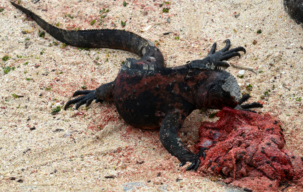 Iguanas verspeist die Plazenta von einem Seelöwen